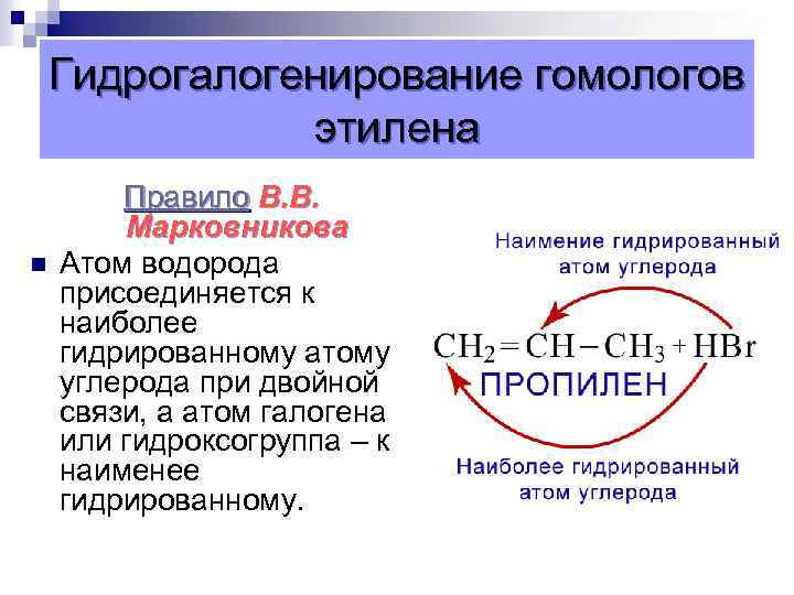 Гидрогалогенирование гомологов этилена n Правило В. В. Марковникова Атом водорода присоединяется к наиболее гидрированному атому углерода при двойной связи, а атом галогена или гидроксогруппа – к наименее гидрированному.
