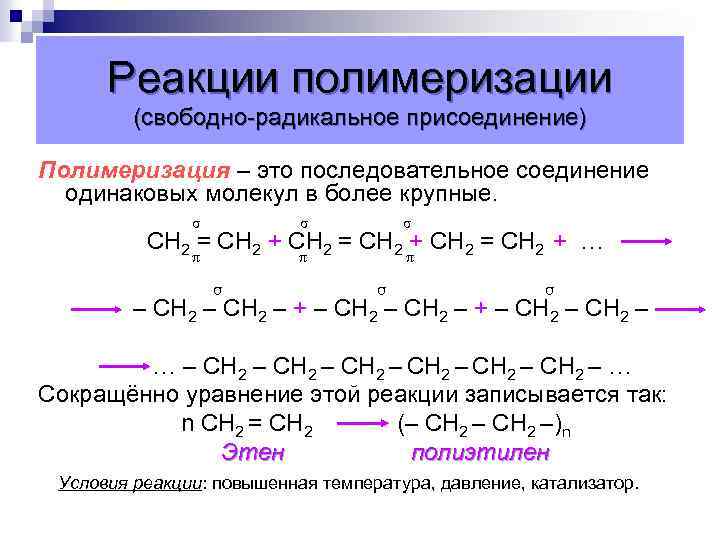 Реакции полимеризации (свободно-радикальное присоединение) Полимеризация – это последовательное соединение одинаковых молекул в более крупные. σ σ σ π π π СН 2 = СН 2 + … σ σ σ – СН 2 – + – СН 2 – … – СН 2 – СН 2 – … Сокращённо уравнение этой реакции записывается так: n СН 2 = СН 2 (– СН 2 –)n Этен полиэтилен Условия реакции: повышенная температура, давление, катализатор.
