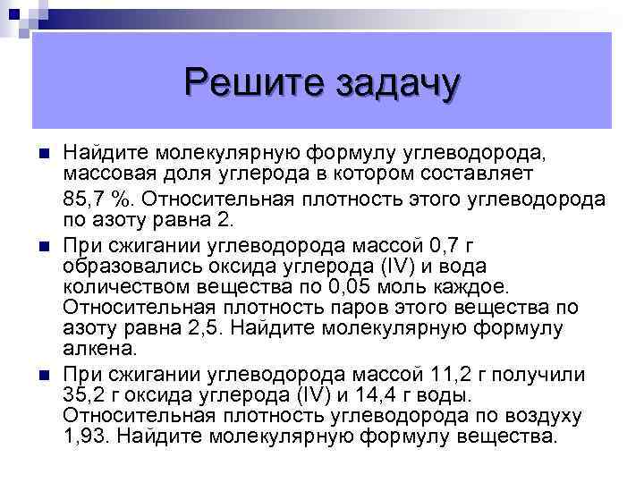 Решите задачу n n n Найдите молекулярную формулу углеводорода, массовая доля углерода в котором составляет 85, 7 %. Относительная плотность этого углеводорода по азоту равна 2. При сжигании углеводорода массой 0, 7 г образовались оксида углерода (IV) и вода количеством вещества по 0, 05 моль каждое. Относительная плотность паров этого вещества по азоту равна 2, 5. Найдите молекулярную формулу алкена. При сжигании углеводорода массой 11, 2 г получили 35, 2 г оксида углерода (IV) и 14, 4 г воды. Относительная плотность углеводорода по воздуху 1, 93. Найдите молекулярную формулу вещества.