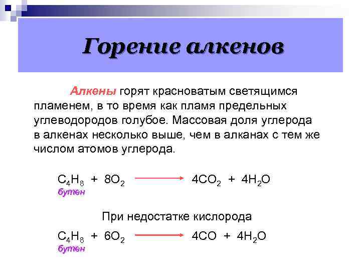 Горение алкенов Алкены горят красноватым светящимся пламенем, в то время как пламя предельных углеводородов голубое. Массовая доля углерода в алкенах несколько выше, чем в алканах с тем же числом атомов углерода. С 4 Н 8 + 8 О 2 бутен 4 СО 2 + 4 Н 2 О При недостатке кислорода С 4 Н 8 + 6 О 2 бутен 4 СО + 4 Н 2 О
