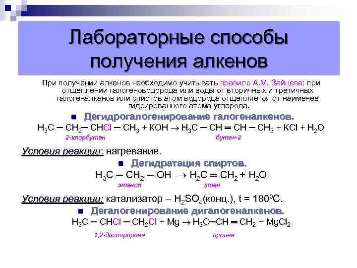 Лабораторные способы получения алкенов При получении алкенов необходимо учитывать правило А. М. Зайцева: при отщеплении галогеноводорода или воды от вторичных и третичных галогеналканов или спиртов атом водорода отщепляется от наименее гидрированного атома углерода. n Дегидрогалогенирование галогеналкенов. Н 3 С ─ СН 2─ СНСl ─ СН 3 + КОН Н 3 С ─ СН ═ СН ─ СН 3 + КСl + Н 2 О 2 -хлорбутан бутен-2 Условия реакции: нагревание. реакции n Дегидратация спиртов. Н 3 С ─ СН 2 ─ ОН Н 2 С ═ СН 2 + Н 2 О этанол этен Условия реакции: катализатор – Н 2 SO 4(конц. ), t = 180ºС. n Дегалогенирование дигалогеналканов. Н 3 С ─ СНCl ─ СН 2 Сl + Мg Н 3 С─СН ═ СН 2 + Mg. Cl 2 1, 2 -дихлорпрпан пропен