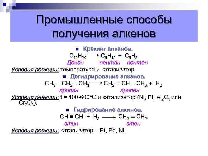 Промышленные способы получения алкенов Крекинг алканов. С 10 Н 20 С 5 Н 12 + С 5 Н 8 Декан пентен Условия реакции: температура и катализатор. n Дегидрирование алканов. СН 3 – СН 2 – СН 3 СН 2 ═ СН – СН 3 + Н 2 пропан пропен Условия реакции: t = 400 -600ºС и катализатор (Ni, Pt, Al 2 O 3 или Cr 2 O 3). n Гидрирование алкинов. CН ≡ СН + Н 2 СН 2 ═ СН 2 этин этен Условия реакции: катализатор – Pt, Pd, Ni. n