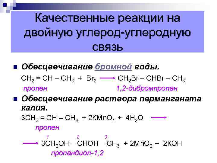 Качественные реакции на двойную углерод-углеродную связь n Обесцвечивание бромной воды. СН 2 = СН – СН 3 + Вr 2 пропен n CH 2 Br – CH 3 1, 2 -дибромпропан Обесцвечивание раствора перманганата калия. 3 СН 2 = СН – СН 3 + 2 КМn. О 4 + 4 Н 2 О пропен 1 2 3 3 СН 2 ОН – СН 3 + 2 Мn. О 2 + 2 КОН пропандиол-1, 2