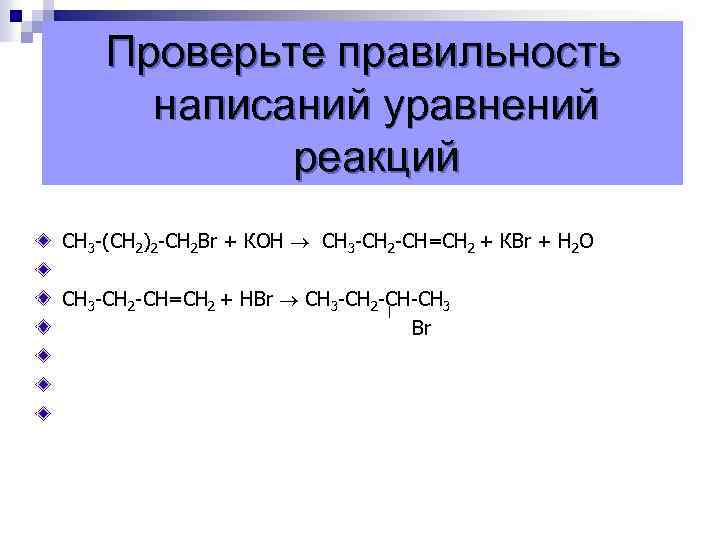 Проверьте правильность написаний уравнений реакций СН 3 -(СН 2)2 -СН 2 Br + КОН СН 3 -СН 2 -СН=СН 2 + КBr + Н 2 О СН 3 -СН 2 -СН=СН 2 + НBr СН 3 -СН 2 -СН-СН 3 Br