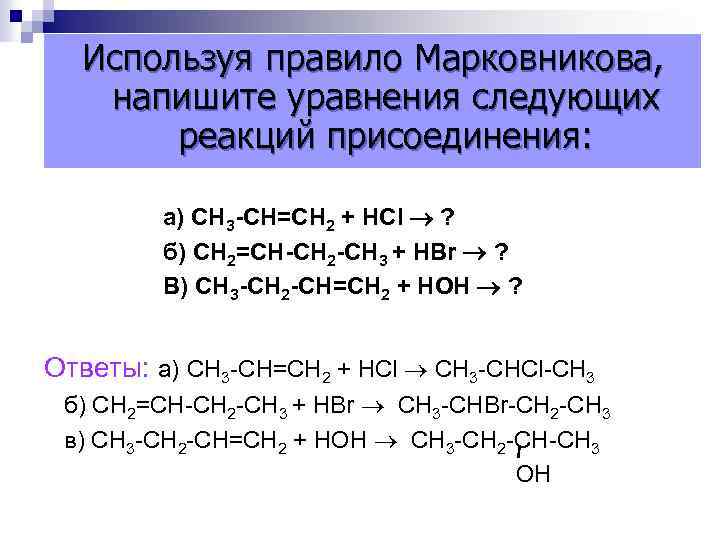 Используя правило Марковникова, напишите уравнения следующих реакций присоединения: а) СН 3 -СН=СН 2 + НСl ? б) СН 2=СН-СН 2 -СН 3 + НBr ? В) СН 3 -СН 2 -СН=СН 2 + НОН ? Ответы: а) СН 3 -СН=СН 2 + НСl СН 3 -СНCl-СН 3 б) СН 2=СН-СН 2 -СН 3 + НBr СН 3 -СНBr-СН 2 -СН 3 в) СН 3 -СН 2 -СН=СН 2 + НОН СН 3 -СН 2 -СН-СН 3 ОН