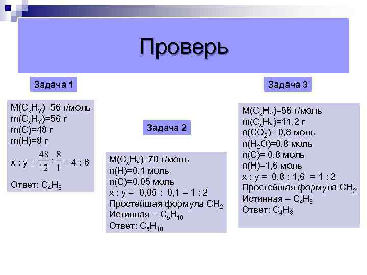 Проверь Задача 1 М(Сх. НY)=56 г/моль m(Сх. НY)=56 г m(С)=48 г m(Н)=8 г x: y= Ответ: С 4 Н 8 =4: 8 Задача 3 Задача 2 М(Сх. НY)=70 г/моль n(Н)=0, 1 моль n(С)=0, 05 моль x : y = 0, 05 : 0, 1 = 1 : 2 Простейшая формула СН 2 Истинная – С 5 Н 10 Ответ: С 5 Н 10 М(Сх. НY)=56 г/моль m(Сх. НY)=11, 2 г n(СО 2)= 0, 8 моль n(Н 2 О)=0, 8 моль n(С)= 0, 8 моль n(Н)=1, 6 моль x : y = 0, 8 : 1, 6 = 1 : 2 Простейшая формула СН 2 Истинная – С 4 Н 8 Ответ: С 4 Н 8