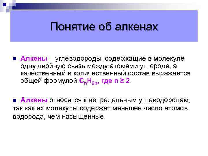Понятие об алкенах n Алкены – углеводороды, содержащие в молекуле одну двойную связь между атомами углерода, а качественный и количественный состав выражается общей формулой Сn. Н 2 n, где n ≥ 2. Алкены относятся к непредельным углеводородам, так как их молекулы содержат меньшее число атомов водорода, чем насыщенные. n