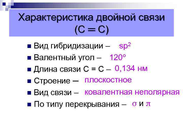 Характеристика двойной связи (С ═ С) Вид гибридизации – sp 2 n Валентный угол – 120º n Длина связи С = С – 0, 134 нм n Строение ─ плоскостное n Вид связи – ковалентная неполярная n По типу перекрывания – σ и π n