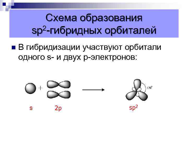 Схема образования sp 2 -гибридных орбиталей n В гибридизации участвуют орбитали одного s- и двух p-электронов: s 2 p sp 2