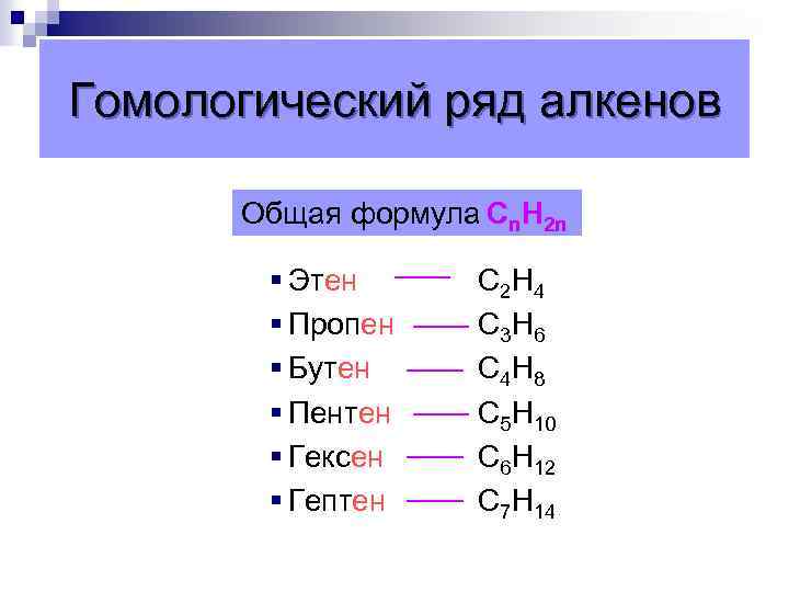Гомологический ряд алкенов Общая формула Сn. Н 2 n § Этен § Пропен § Бутен § Пентен § Гексен § Гептен C 2 H 4 C 3 H 6 C 4 H 8 C 5 H 10 C 6 H 12 C 7 H 14