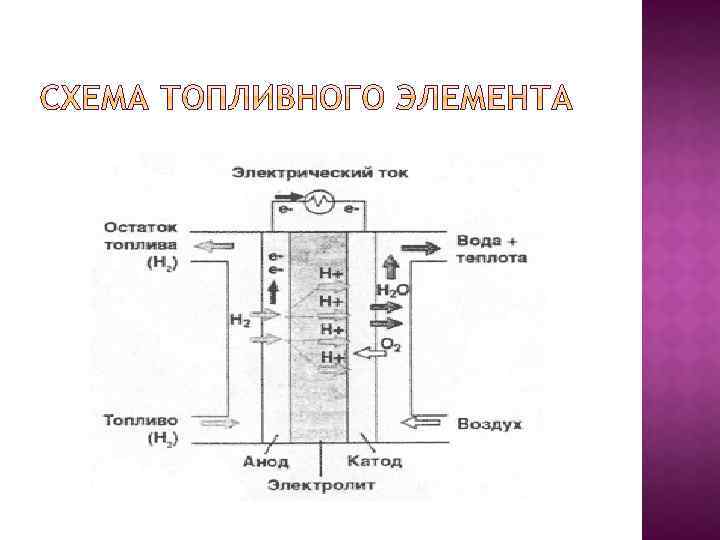 Тип элемента Рабочие КПД температуры, (выход °С электрической энергии), % Суммарный КПД, % Топливные элементы с протонообменной мембраной (PEMFC) 60– 160 30– 35 50– 70 Топливные элементы на основе ортофосфорной (фосфорной) кислоты (PAFC) 150– 200 35 70– 80 Топливные элементы на основе расплавленного карбоната (MCFC) 600– 700 45– 50 70– 80 Твердотельные оксидные топливные элементы (SOFC) 700– 1 000 50– 60 70– 80