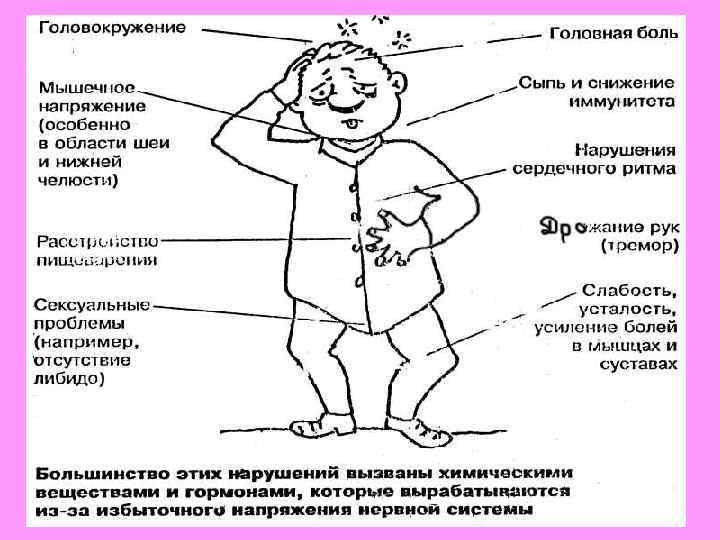 Психофизиологический механизм стресса (+) Выброс в кровь адреналина или норадреналина из надпочечников. Эти гормоны действуют как мощные стимуляторы, ускоряющие рефлексы, увеличивающие частоту сердцебиений, повышающие кровяное давление и уровень сахара в крови и усиливающие весь обмен веществ. В результате улучшаются кратковременные возможности и деятельность организма. (-) Но, если все это не переходит мгновенно в действие, долговременные последствия могут включать нарушения: • сердечно-сосудистые (сердечные заболевания и приступы); • почечные, вызванные повышенным кровяным давлением; • регуляции уровня сахара в крови, ведущие к диабету и гипогликемии.