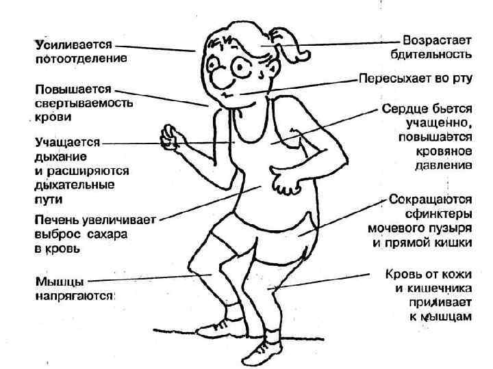 (+) Поступление в кровяное русло гормонов щитовидной железы. Эти гормоны интенсифицируют обмен веществ, тем самым, увеличивая скорость, с которой энергия может быть усвоена и превращена в психическую активность. (+) Поступление в кровяное русло холестерина из печени. Это способствует дальнейшему повышению энергетического уровня, обеспечивая работу мышц. (-) Но, если допустить слишком длительное усиление обмена веществ, это приведет к истощению, потере веса и, в конечном счете, к физическому коллапсу. (-) Но постоянно растущий уровень холестерина в крови тесно связан с возрастающим риском артериосклероза (уплотнением артерий), главным фактором при сердечных приступах.