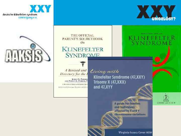 Фенотипические проявления Нормальный кариотип 46, XY Синдром Клайнфельтера 47, XXY Склонность к образованию залысин Скудный рост волос на лице Уменьшение роста волос на груди Гинекомастия Узкие плечи Остеопороз Оволосение по женскому типу Небольшой размер яичек Широкие бедра Длинные руки и ноги