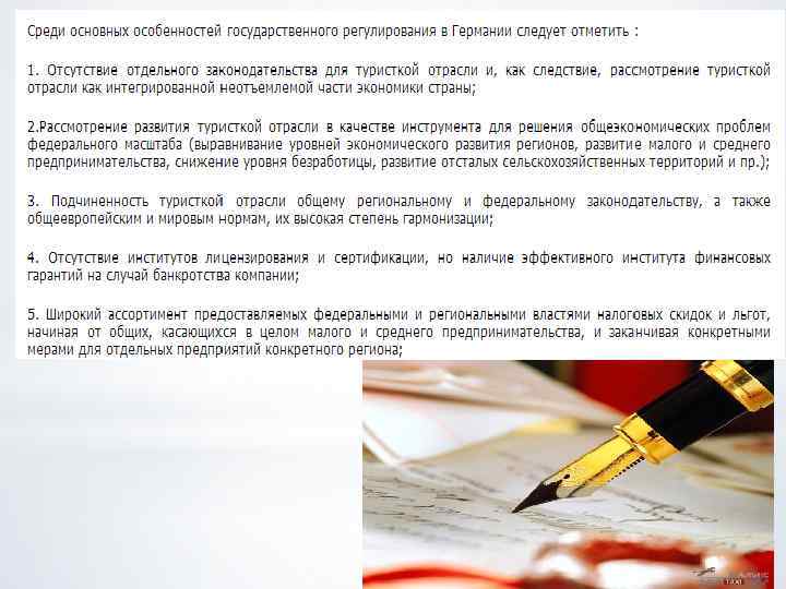 Нормативно-правовое регулирование Официальный орган туризма в Германии Национальный комитет Германии по туризму, который подчиняется Министерству экономики Германии, главными задачами которого являются продвижение туризма в Германии и увеличение турпотока в страну. Представительства комитета функционируют в 29 странах мира.