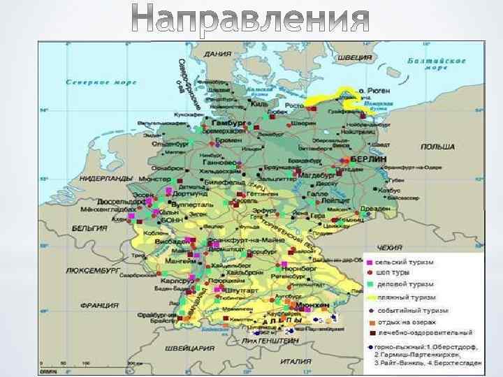 1. Пляжный – Балтийское побережье Германии. Здоровый климат, живописные ландшафты, отличные пляжи и гостеприимство — главные составляющие успеха Балтийского побережья Германии у туристов. На побережье созданы все условия для занятий водными видами спорта, есть также и великолепные возможности для лечения и оздоровления. 2. Сельский туризм. Германии присуща особая организация размещения туристов в сельской местности. В целом туристы предпочитают жить и питаться непосредственно в хозяйских домах, а строительство новых коттеджей в сельских районах не очень практикуется. В Германии распространен фермерский туризм.