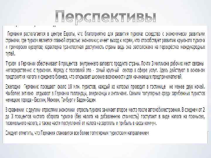 По статистике, Германия является в наши дни одним из наиболее безопасных направлений для туризма во всём мире. Эта прекрасная страна является третьей по посещаемости европейской страной. Большинство туристов прибывает сюда из Швейцарии, Нидерландов и США. Можно выделить следующие основные факторы, которые привлекают туристов в страну: 1. Высокая концентрация исторических и культурных достопримечательностей; 2. Упрощенный визовый режим (возможность широкого спектра комплексных туров); 3. Высокий уровень сервиса.