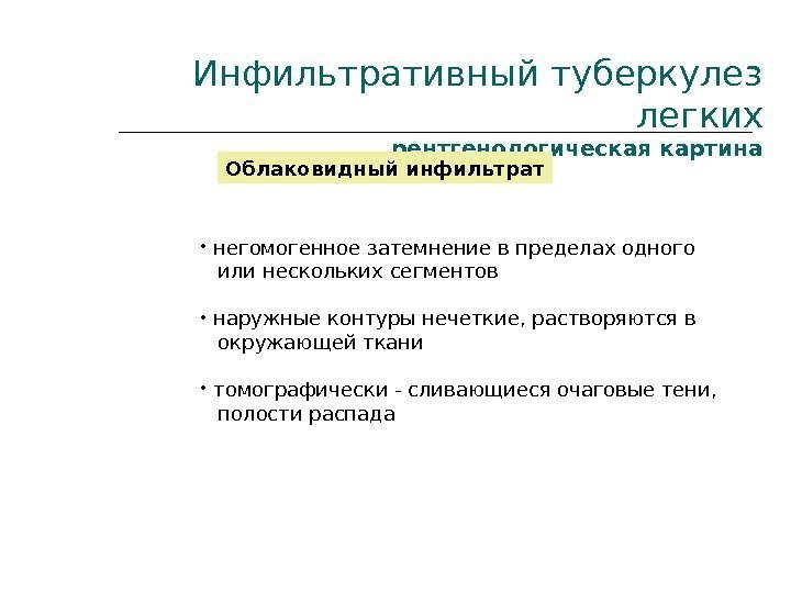Инфильтративный туберкулез легких рентгенологическая картина Облаковидный инфильтрат • негомогенное затемнение в пределах одного или нескольких сегментов • наружные контуры нечеткие, растворяются в окружающей ткани • томографически — сливающиеся очаговые тени, полости распада