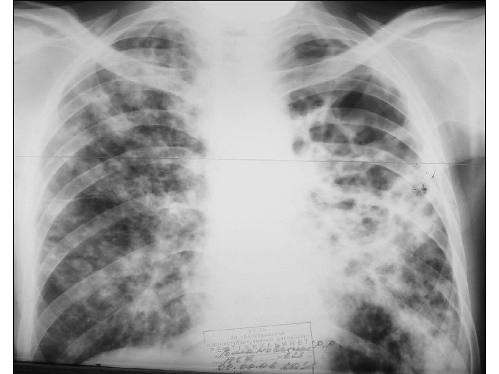 Казеозная пневмония диагностика • анамнез • отрицательная анергия при р. Манту • обильное выделение МБТ • лейкоцитоз, лимфопения, сдвиг влево, увеличение СОЭ до 30 -60 мм / ч Рентгенологическая картина: при лобарной форме — затемнение в пределах доли, неоднородное, с просветлениями неправильной формы, затем формируются тонкостенные каверны различных размеров при лобулярной форме — множество крупноочаговых теней и фокусов неправильной формы, без четких границ, средней или высокой интенсивности, склонных к слиянию; — формирование крупных (гигантских) каверн и мелких (дочерних) каверн