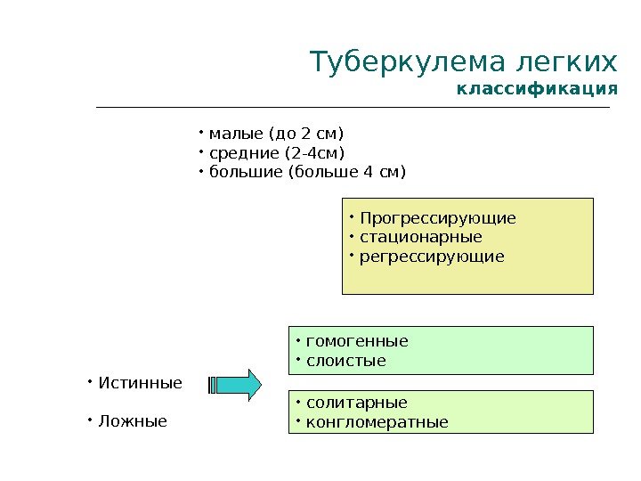 Туберкулема легких классификация • малые (до 2 см) • средние (2 -4 см) • большие (больше 4 см) • Прогрессирующие • стационарные • регрессирующие • Истинные • Ложные • гомогенные • слоистые • солитарные • конгломератные