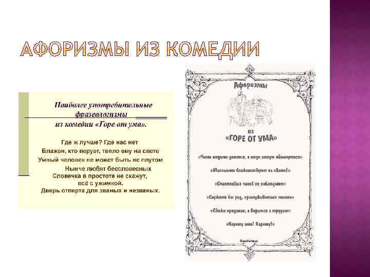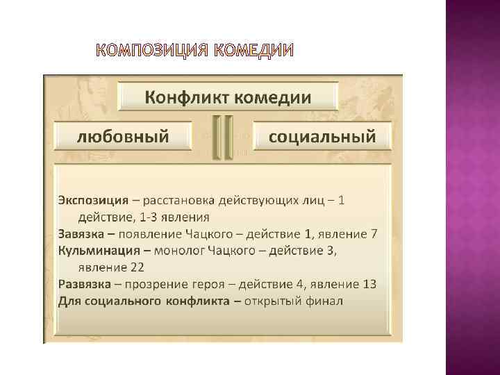 «В моей комедии 25 глупцов на одного здравомыслящего человека» , - писал А. С. Грибоедов Катенину. В этом заявлении автора явно обозначена главная проблема «Горя от ума» – проблема ума и глупости. Комедия «Горе от ума» являлась передовой для своего времени. Она носила обличительный характер, как и все классицистические комедии. Но проблемы произведения «Горе от ума» , проблемы дворянского общества того времени представлены в более широком спектре. Основным конфликтом пьесы является противостояние «века нынешнего» и «века минувшего» , старого и нового. В спорах Чацкого с представителями старомосковского дворянства вырисовывается система взглядов одной и другой стороны на образование, культуру, в частности на проблему языка (смесь «французского с нижегородским» ), семейные ценности, вопросы чести и совести.