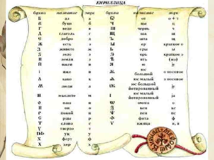 Кириллица Старославянская азбука была составлена ученым Кириллом и его братом Мефодием по просьбе моравских князей. Она так и называется кириллица. Это славянская азбука, в ней 43 буквы, (19 гласных). Каждая имеет своё название, похожее на обычные слова: А - аз, Б – буки, В - веди, Г – глаголь, Д – добро, Ж – живете, З - земля и так далее. Азбука – само название образовано от названия двух первых букв. На Руси кириллица получила распространение после принятия христианства (988 г. ) Славянский алфавит оказался прекрасно приспособленным к точной передаче звуков древнерусского языка. Эта азбука положена в основу нашего алфавита.