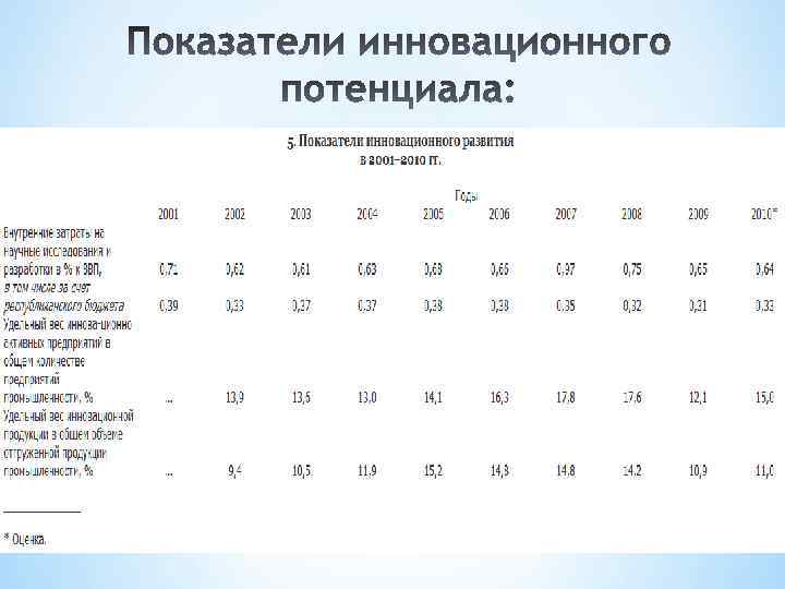 * Наукоемкость ВВП - в 2009 году составила 0, 77% Доля Беларуси на мировом рынке наукоемкой продукции составляет около 3 %(доля США — 39 %, Японии— 30 %, Германии— 16 %). * Среднегодовая численность работников науки - С 1990 численность работников, выполнявших НИОКР, в Беларуси со кратилась в 3, 4 раза, тогда как в странах с устой чивой экономикой наблюдается его стабильный рост на 3 -5 % в год. В настоящее время на каждые 10 тыс. жителей республи ки приходится около 35 исследователей, (в США - 52, Израиле 38, России - 32, ФРГ - 29, Франции - 26, ). * Доля научных работников в общей численности занятых в НЭ * Количество научных организаций - В республике 446 организаций и предприятий выполняют НИОКР, в них задействовано около 33 516 работников. Основ ная часть научного потенциала сосредоточена в НАН Белару си, Министерстве промышленности, Министерстве образова ния, Министерстве здравоохранения, Министерстве сельского хозяйства и продовольствия, Белорусском государственном университете, концерне «Белнефтехим» . Здесь сосредоточено около 72 % организаций, 82 % работников и 85 % внутренних текущих затрат на науку. * Объёмы и структура исследований и разработок- ИР (фундаментальные и приклодные исследования , гос. Научно-технические программы, отраслевые ИР). * Финансовое обеспечение – источники финансирования, обьем затрат на ИР. * Материально-техническая база- научное оборудование, приборы, производственные помещения. * Научно-информационные ресурсы- библиотечные и патентные фонды, компьютерные и инновационные системы, интернет-хосты. * Система управления научной сферой, процессами ИР.