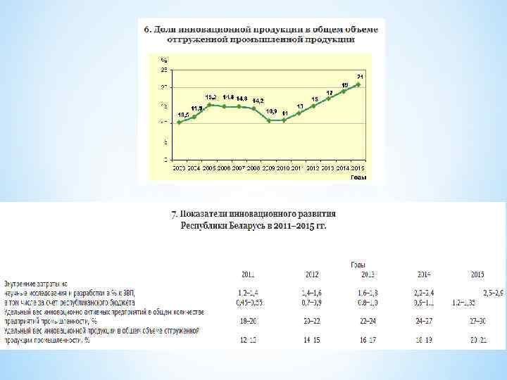 Государственные программы и развитие 2007 -2010 и 2011 -2015 * Основной целью госпрограммы инновационного развития на 2011 -2015 годы является создание конкурентоспособной на мировом рынке, инновационной, наукоемкой, ресурсо- и энергосберегающей, эколого-безопасной, социально ориентированной экономики, обеспечивающей устойчивое социально-экономическое развитие Беларуси и повышение качества жизни белорусского народа. * Главным направлением преобразований производственного потенциала республики станет внедрение новых высоких технологий 5 и 6 -го технологических укладов, обладающих наибольшей добавленной стоимостью и низкой энерго- и материалоемкостью, производство новейших эколого-безопасных материалов и продуктов. * Для модернизации экономики на основе технологических инноваций планируется осуществить более 500 проектов по созданию инновационных предприятий и прогрессивных производств. В результате реализации госпрограммы инновационного развития на 2011 -2015 годы планируется к 2015 году довести долю новой продукции в общем объеме продукции промышленности до 25%. Доля инновационно активных предприятий в общем количестве промышленных предприятий должна составить 30, 5%, доля сертифицированной продукции в общем объеме промышленного производства должна вырасти до 73, 9%. * Для обеспечения конкурентоспособности на мировых рынках белорусских товаров, работ и услуг в предстоящем пятилетии необходимо обеспечить повышение техникоэкономического уровня всей производимой в стране продукции. Стратегическим приоритетом в повышении конкурентоспособности экономики является вхождение Беларуси в число тридцати наиболее конкурентоспособных стран мира.