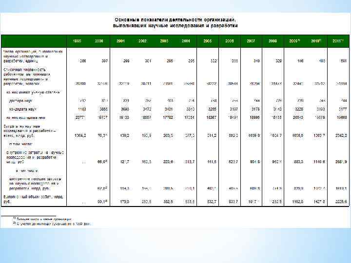Количество научных организаций Объемы и структура исслед-й и разработок (фундаментальные и прикладные иссл-я, гос. научно-тех. программы, отраслевая структура ИР) Научные кадры Финансовое обеспечение Материальнотехническая база Научноинформационны е ресурсы