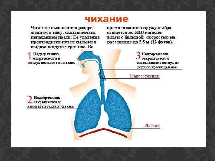 Чихание Чиханье (лат. sternutatio) — защитный безусловный рефлекс человека и высших животных, обеспечивающий удаление из верхних дыхательных путей пыли, слизи и других раздражающих агентов путём форсированного выдоха, преимущественно через носоглотку, после короткого глубокого вдоха. В отличие от кашля, при чиханье язык прижимается к мягкому нёбу, поэтому форсированный выдох осуществляется через нос.