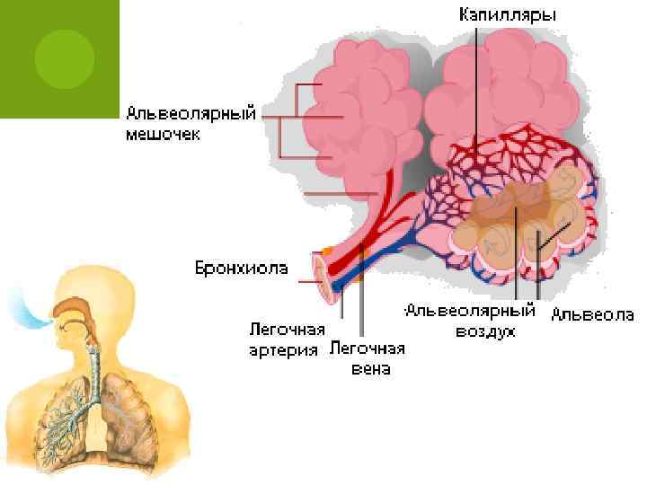 1 – кровь, бедная кислородом, поступает от сердца; 2 – тончайшие кровеносные сосуды; 3 – бронхиола; 4 поступление воздуха; 5 – кровь, богатая кислородом, поступает к сердцу; 6 – газообмен в пузырьке легкого