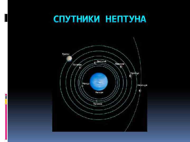 У Нептуна на данный момент известно 13 спутников. Масса крупнейшего составляет более, чем 99, 5 % от суммарной массы всех спутников Нептуна – это Тритон, открытый Уильямом Ласселом всего через 17 дней после открытия Нептуна. Из-за приливного ускорения Тритон медленно двигается по спирали к Нептуну, и, в конечном счёте, будет разрушен. В 1989 году Тритона была проведена оценка температуры, которая составила − 235 °C. Тритон является одним из трёх спутников планет Солнечной системы, имеющих атмосферу.