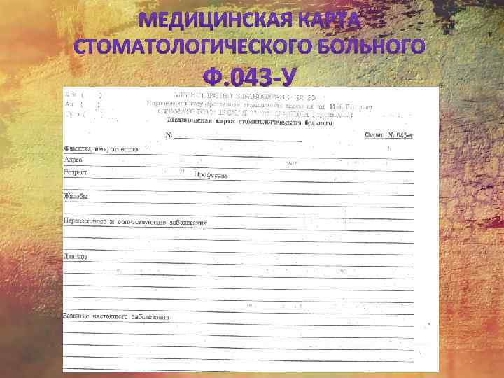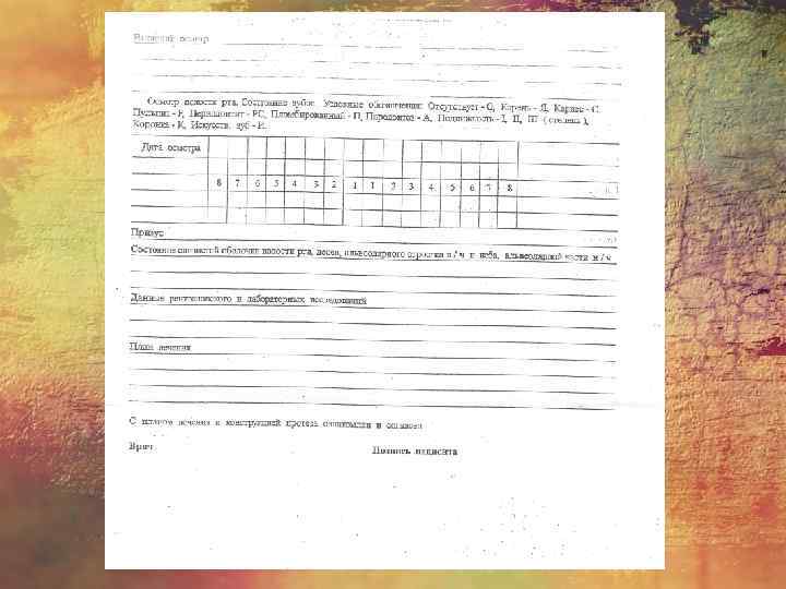 1. Комбинированная карта ВОЗ стоматологического статуса и нуждаемости в лечении; 2. Карта стоматологического здоровья; 3. Карта осмотра полости рта; 4. Медицинская карта стоматологического больного ф. 043 -у
