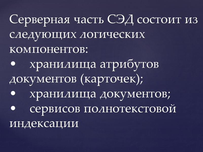 Серверная часть СЭД состоит из следующих логических компонентов: • хранилища атрибутов документов (карточек); • хранилища документов; • сервисов полнотекстовой индексации