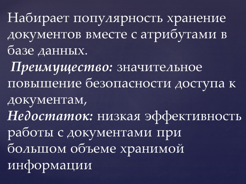 Набирает популярность хранение документов вместе с атрибутами в базе данных. Преимущество: значительное повышение безопасности доступа к документам, Недостаток: низкая эффективность работы с документами при большом объеме хранимой информации