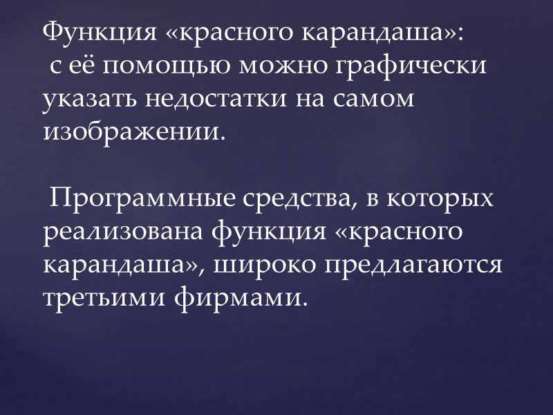 Функция «красного карандаша»: с её помощью можно графически указать недостатки на самом изображении. Программные средства, в которых реализована функция «красного карандаша», широко предлагаются третьими фирмами.