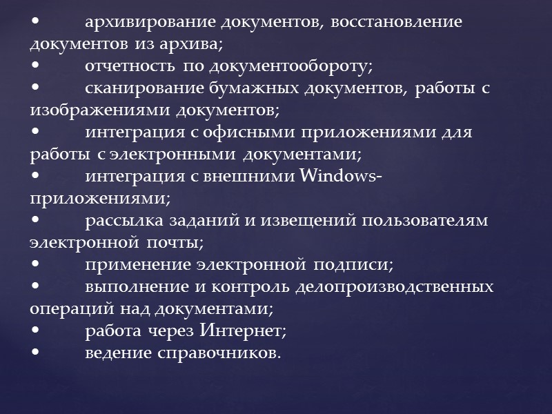 • архивирование документов, восстановление документов из архива; • отчетность по документообороту; • сканирование бумажных документов, работы с изображениями документов; • интеграция с офисными приложениями для работы с электронными документами; • интеграция с внешними Windows-приложениями; • рассылка заданий и извещений пользователям электронной почты; • применение электронной подписи; • выполнение и контроль делопроизводственных операций над документами; • работа через Интернет; • ведение справочников.