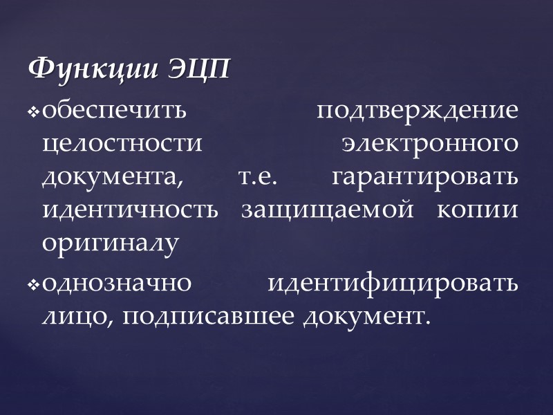 Функции ЭЦП обеспечить подтверждение целостности электронного документа, т.е. гарантировать идентичность защищаемой копии оригиналу однозначно идентифицировать лицо, подписавшее документ.