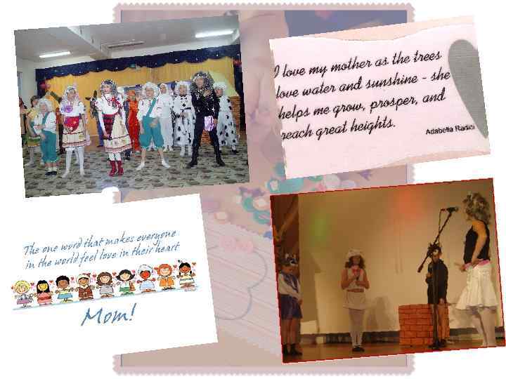 О внеклассном мероприятии: Внеклассное мероприятие проводится для учеников 3 класса (можно задействовать две параллели). Подготовка начинается заранее. Дети принимают участие в пьесах и миниатюрах, а, не участвующие, помогают в оформлении зала и декораций, читают стихи и поют песни (которые могут быть взяты из учебника И. Н. Верещагиной, 3 класса в соответствии со школьно программой). Также, помимо заучивания своих ролей, дети на уроках труда изготовляют открытки для своих мам, которые впоследствии подарят их по окончанию мероприятия.