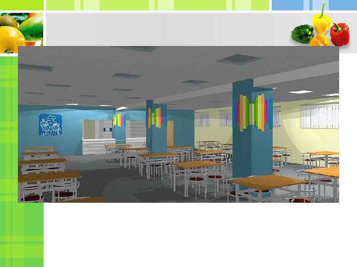 Цветовое решение обеденного зала призвано создать благоприятную психо – эмоциональный настрой обучающихся. Предлагаем оформить обеденный зал в ярких теплых тонах персикового и желтого цветов с добавлением контрастного синего.