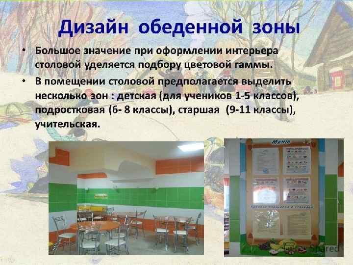 Дизайн обеденной зоны. При проектировании дизайна школьной столовой нужно учитывать , что в ней дети должны отдыхать после тяжелого учебного дня. Наша столовая должна быть не только уютной и комфортной, но и нести в себе удобство для детей и персонала. Очень важно в дизайне интерьера школьной столовой использовать качественную мебель.