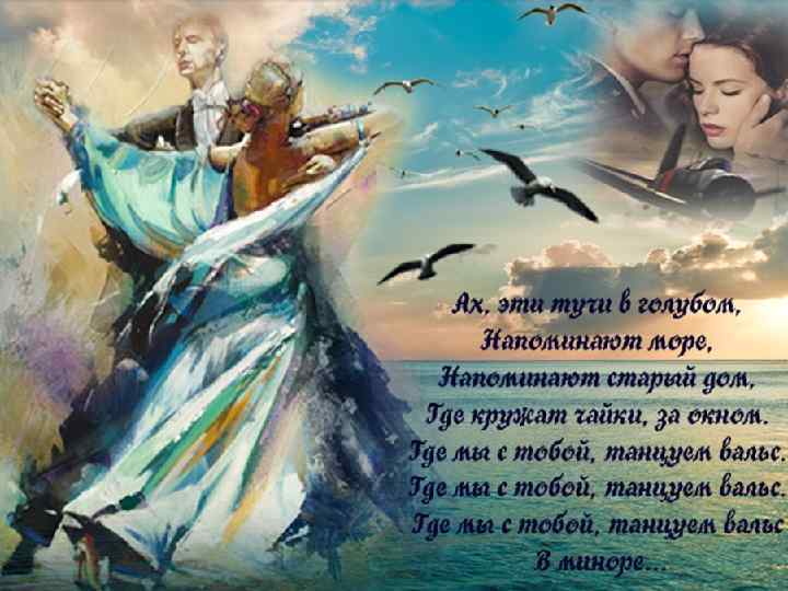 Снова весь фронт раскален от огня Лупят зенитки три ночи, три дня А в гимнастерке, на снимке Ты обнимаешь меня. . . Ах, эти тучи в голубом, Напоминают море, Напоминают старый дом Где кружат чайки, за окном Где мы с тобой, танцуем вальс В миноре Если останусь живым на войне Встречусь с тобой, я в родной стороне Только пока я воюю, Ты не забудь обо мне. . . Ах, эти тучи в голубом, Напоминают море, Напоминают старый дом Где кружат чайки, за окном Где мы с тобой, танцуем вальс В миноре Юнкер все кружит и небо в огне Думай родная всегда обо мне Из-поднебесья мне виден Милый твой профиль в окне. . . Ах, эти тучи в голубом, Напоминают море, Напоминают старый дом Где кружат чайки, за окном Где мы с тобой, танцуем вальс Где мы с тобой, станцуем вальс В мажоре