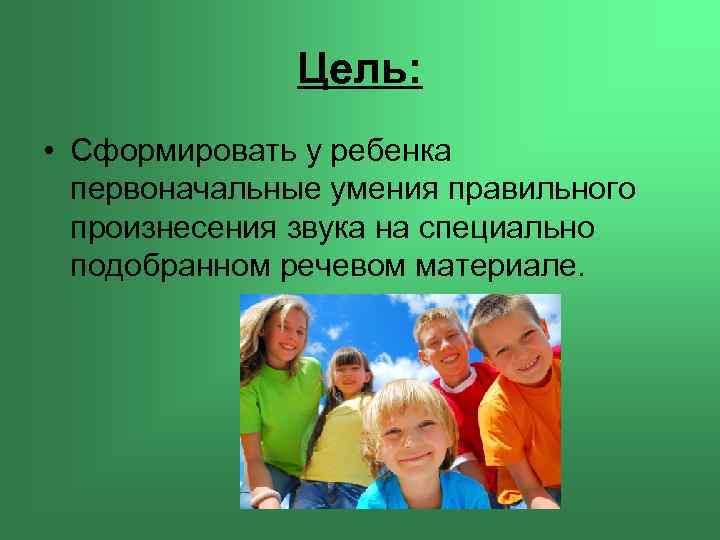 Цель: • Сформировать у ребенка первоначальные умения правильного произнесения звука на специально подобранном речевом материале.