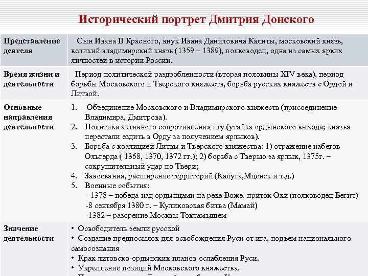 Исторический портрет Дмитрия Донского Представление деятеля Сын Ивана II Красного, внук Ивана Даниловича Калиты, московский князь, великий владимирский князь (1359 – 1389), полководец, одна из самых ярких личностей в истории России. Время жизни и деятельности Период политической раздробленности (вторая половины XIV века), период борьбы Московского и Тверского княжеств, борьба русских княжеств с Ордой и Литвой. Основные направления деятельности 1. 2. 3. 4. 5. Значение деятельности Объединение Московского и Владимирского княжеств (присоединение Владимира, Дмитрова). Политика активного сопротивления игу (утайка ордынского выхода; князья перестали ездить в Орду за получением ярлыков). Борьба с коалицией Литвы и Тверского княжества: 1) отражение набегов Ольгерда ( 1368, 1370, 1372 гг. ); 2) борьба с Тверью за ярлык, 1375 г. – сокрушительный удар по Твери; Завоевания, расширение территорий (Калуга, Мценск и т. д. ) Военные события: - 1378 – победа над ордынцами на реке Воже, приток Оки (полководец Бегич) -8 сентября 1380 г. – Куликовская битва (Мамай) -1382 – разорение Москвы Тохтамышем • Освободитель земли русской • Создание предпосылок для освобождения Руси от ига, подъем национального самосознания • Крах литовско-ордынских планов ослабления Руси. • Укрепление позиций Московского княжества.