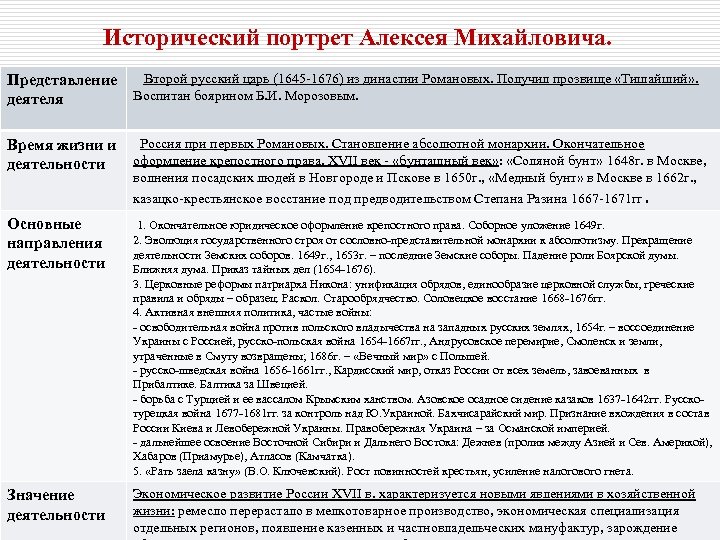Исторический портрет Алексея Михайловича. Представление деятеля Второй русский царь (1645 -1676) из династии Романовых. Получил прозвище «Тишайший» . Воспитан боярином Б. И. Морозовым. Время жизни и деятельности Россия при первых Романовых. Становление абсолютной монархии. Окончательное оформление крепостного права. XVII век - «бунташный век» : «Соляной бунт» 1648 г. в Москве, волнения посадских людей в Новгороде и Пскове в 1650 г. , «Медный бунт» в Москве в 1662 г. , казацко-крестьянское восстание под предводительством Степана Разина 1667 -1671 гг. Основные направления деятельности 1. Окончательное юридическое оформление крепостного права. Соборное уложение 1649 г. 2. Эволюция государственного строя от сословно-представительной монархии к абсолютизму. Прекращение деятельности Земских соборов. 1649 г. , 1653 г. – последние Земские соборы. Падение роли Боярской думы. Ближняя дума. Приказ тайных дел (1654 -1676). 3. Церковные реформы патриарха Никона: унификация обрядов, единообразие церковной службы, греческие правила и обряды – образец. Раскол. Старообрядчество. Соловецкое восстание 1668 -1676 гг. 4. Активная внешняя политика, частые войны: - освободительная война против польского владычества на западных русских землях, 1654 г. – воссоединение Украины с Россией, русско-польская война 1654 -1667 гг. , Андрусовское перемирие, Смоленск и земли, утраченные в Смуту возвращены; 1686 г. – «Вечный мир» с Польшей. - русско-шведская война 1656 -1661 гг. , Кардисский мир, отказ России от всех земель, завоеванных в Прибалтике. Балтика за Швецией. - борьба с Турцией и ее вассалом Крымским ханством. Азовское осадное сидение казаков 1637 -1642 гг. Русскотурецкая война 1677 -1681 гг. за контроль над Ю. Украиной. Бахчисарайский мир. Признание вхождения в состав России Киева и Левобережной Украины. Правобережная Украина – за Османской империей. - дальнейшее освоение Восточной Сибири и Дальнего Востока: Дежнев (пролив между Азией и Сев. Америкой), Хабаров (Приамурье), Атласов (Камчатка). 5. «Рать заела казну» (В. О. Ключевский). Рост повинностей крестьян, усиление налогового гнета. Значение деятельности Экономическое развитие России XVII в. характеризуется новыми явлениями в хозяйственной жизни: ремесло перерастало в мелкотоварное производство, экономическая специализация отдельных регионов, появление казенных и частновладельческих мануфактур, зарождение