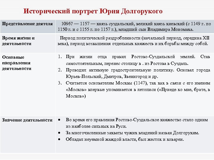 Исторический портрет Юрия Долгорукого Представление деятеля 1096? — 1157 — князь суздальский, великий князь киевский (с 1149 г. по 1150 г. и с 1155 г. по 1157 г. ), младший сын Владимира Мономаха. Время жизни и деятельности Период политической раздробленности (начальный период, середина XII века), период возвышения отдельных княжеств и их борьбы между собой. Основные направления деятельности 1. При жизни отца правил Ростово-Суздальской землей. Став самостоятельным, перенес столицу в. из Ростова в Суздаль. 2. Проводил активную градостроительную политику. Основал города Юрьев-Польский, Дмитров, Звенигород и др. 3. Считается основателем Москвы (1147), так как в связи с его именем «Москов» впервые упоминается в летописи ( «Приеде ко мне, брате, в Москов» ) Значение деятельности Во время его правления Ростово-Суздальское княжество стало одним из наиболее сильных на Руси. За многочисленные захваты чужих владений назван Долгоруким. Обладал неуемной жаждой власти, был жесток и коварен.