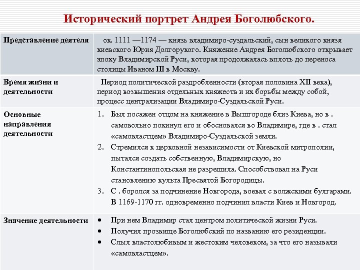 Исторический портрет Андрея Боголюбского. Представление деятеля ок. 1111 — 1174 — князь владимиро-суздальский, сын великого князя киевского Юрия Долгорукого. Княжение Андрея Боголюбского открывает эпоху Владимирской Руси, которая продолжалась вплоть до переноса столицы Иваном III в Москву. Время жизни и деятельности Период политической раздробленности (вторая половина XII века), период возвышения отдельных княжеств и их борьбы между собой, процесс централизации Владимиро-Суздальской Руси. Основные направления деятельности 1. Был посажен отцом на княжение в Вышгороде близ Киева, но в. самовольно покинул его и обосновался во Владимире, где в. стал «самовластцем» Владимиро-Суздальской земли. 2. Стремился к церковной независимости от Киевской митрополии, пытался создать собственную, Владимирскую, но Константинопольская не разрешила. Способствовал на Руси становлению культа Пресвятой Богородицы. 3. С. боролся за подчинение Новгорода, воевал с волжскими булгарами. В 1169 -1170 гг. одновременно подчинил власти Киев и Новгород. Значение деятельности При нем Владимир стал центром политической жизни Руси. Получил прозвище Боголюбский по названию его резиденции. Слыл властолюбивым и жестоким человеком, за что его называли «самовластцем» .