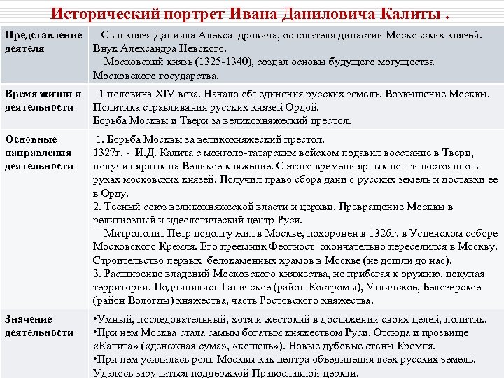 Исторический портрет Ивана Даниловича Калиты. Представление деятеля Сын князя Даниила Александровича, основателя династии Московских князей. Внук Александра Невского. Московский князь (1325 -1340), создал основы будущего могущества Московского государства. Время жизни и деятельности 1 половина XIV века. Начало объединения русских земель. Возвышение Москвы. Политика стравливания русских князей Ордой. Борьба Москвы и Твери за великокняжеский престол. Основные направления деятельности 1. Борьба Москвы за великокняжеский престол. 1327 г. - И. Д. Калита с монголо-татарским войском подавил восстание в Твери, получил ярлык на Великое княжение. С этого времени ярлык почти постоянно в руках московских князей. Получил право сбора дани с русских земель и доставки ее в Орду. 2. Тесный союз великокняжеской власти и церкви. Превращение Москвы в религиозный и идеологический центр Руси. Митрополит Петр подолгу жил в Москве, похоронен в 1326 г. в Успенском соборе Московского Кремля. Его преемник Феогност окончательно переселился в Москву. Строительство первых белокаменных храмов в Москве (не дошли до нас). 3. Расширение владений Московского княжества, не прибегая к оружию, покупая территории. Подчинились Галичское (район Костромы), Угличское, Белозерское (район Вологды) княжества, часть Ростовского княжества. Значение деятельности • Умный, последовательный, хотя и жестокий в достижении своих целей, политик. • При нем Москва стала самым богатым княжеством Руси. Отсюда и прозвище «Калита» ( «денежная сума» , «кошель» ). Новые дубовые стены Кремля. • При нем усилилась роль Москвы как центра объединения всех русских земель. Удалось заручиться поддержкой Православной церкви.