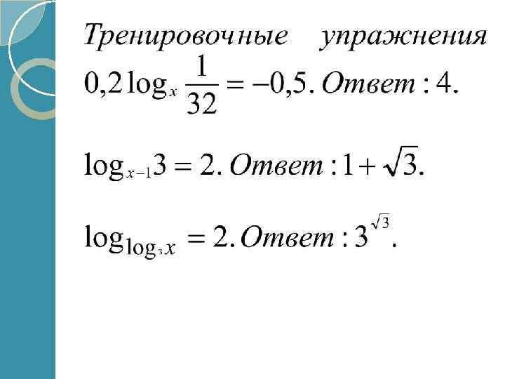 1. Решение уравнений, основанных на определении логарифма log 2(5 – x) = 3. По определению логарифма 5 – х = 23, откуда х = – 3 – корень уравнения. Ответ: х = – 3.