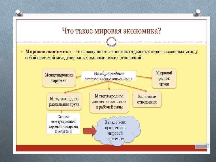 специализация отдельных стран по производству отдельных видов продукции Мировая экономика Система национальных хозяйств, объединенных международным разделением труда, торговыми, производственными и другими экономическими связями Мировой рынок мировой рынок товаров и услуг мировой рынок капиталов мировой рынок рабочей силы мировой финансовый рынок мировые цены